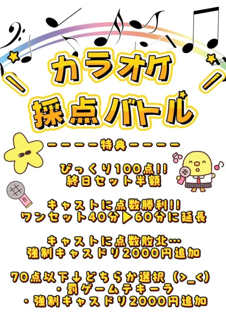 📅 12/5〜12/13まで 🎤🔥 \カラオケ採点バトル開催/🔥🎤 100点出したら 終日セット半額…!?🤯キャストに勝ったら 40分▶60分延長💖 負けたら…👉 強制キャスドリ追加🥹👉 罰ゲームテキーラ😈(選べる) 歌う?逃げる?🔥今日のふららぼは修羅の音楽室🔥